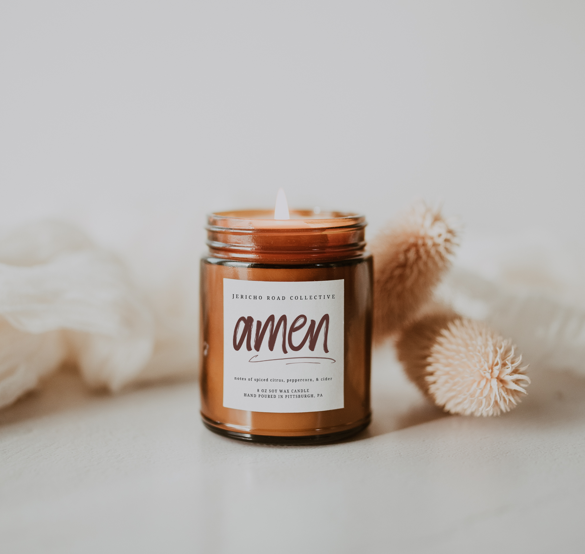 Candle: Amen Candle in a Glass Amber Jar Scent Notes: Spiced Citrus, Peppercorn and Cider!